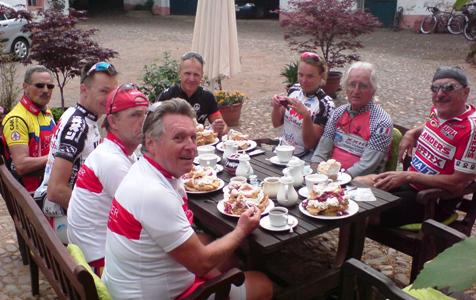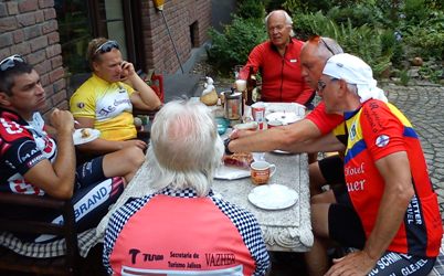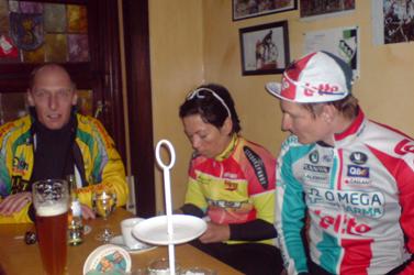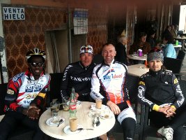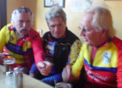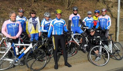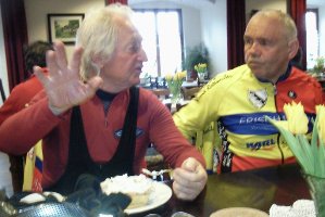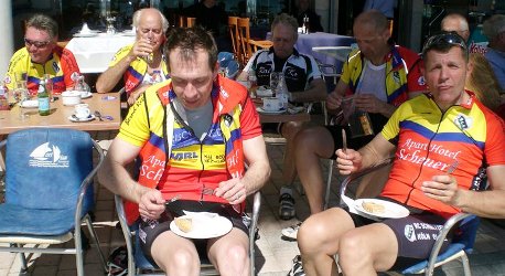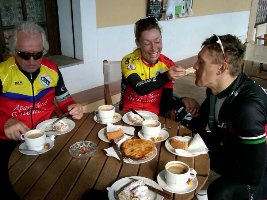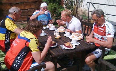 Nach dem Frühstück ab auf die Fahrräder und los ging es Richtung Belgien. Willi fand immer schöne kleine Sträßchen, die knackig nach oben gingen. Kurz vor Losheim nach ca. 60km wurde dem "einen zu kalt" der eine oder andere schwächelte und so wurde neu sondiert. Drei fuhren zurück und die Anderen Richtung Schleiden um hier Essen zu fassen. Lecker "Krützchen" wurde bestellt und danach gab es Streuselkuchen, frisch aus dem Ofen. Zurück endlich mal Rückenwind, flugs war man wieder in Nettersheim. Der Abend klang mit der vorletzten Etappe Paris-Nizza langsam aus und natürlich wurde eifrig über die Ausreden der Schwächelnden hergezogen "Stephan, dir ist doch nicht kalt oder?"