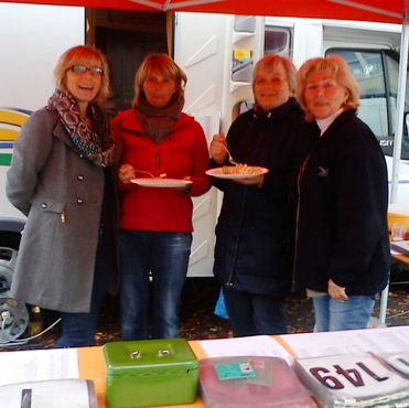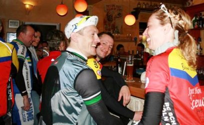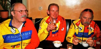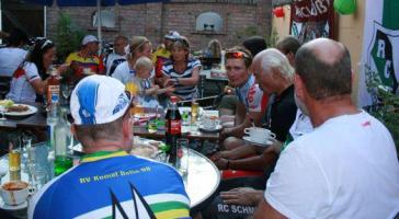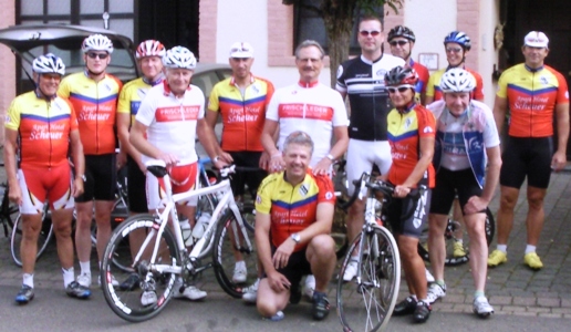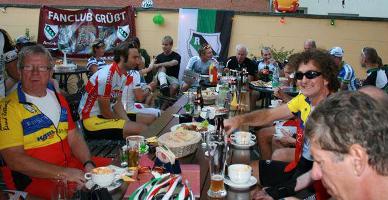 Was in Radfahrerkreisen wie eine unmögliche Übersetzung klingt, ist eigentlich ganz anders zu lesen. Zweiundsechsig – das war letztlich die stattliche Teilnehmerzahl bei unserer Clubanfahrt. Wer immer auch für das Wetter zuständig war senkte die ersten Tröpfchen erst zu Boden, als auch der letzte Schmitter in unserer Stammkneipe bei Gerti eintrudelte. Da hatte sich dann aber einer ziemlich weit über seinen aktuellen Fitnesstand hinaus verausgabt. Macht nichts Rene… der schmerzhafte Einstieg ist geschafft. Abhaken… denn was nun folgt ist… die Form zur Spitze treiben. Neben reichlich Kaltschale aus Gerste und einem verdauungsfreundlichen Chili vom Verein, ließ es sich unser Martin nicht nehmen eine Gulaschsuppe zu geben und unser Hein Fix kredenzte noch einen deftigen Krustenbraten. Nachdem das erste Fässchen in den Kehlen der Durstigen förmlich verdampft war spendierte unser Friedel Höhn in Kooperation mit unserem Neumitglied Sylvia Nachschub. Allen Spendern möchten wir ganz herzlich danken. Zum Start unserer Anfahrt gab es das übliche Gruppenfoto. Unsere Meggi hatte reichlich zu tun, bevor sie alle Protagonisten auf dem rechten Fleck platziert hatte. Für das nächste Jahr wissen wir nun, das sich schmale Mädels und Jungs nicht unbedingt breit aufstellen müssen. Unsere Anfahrt bot für jeden Gusto etwas. Die Wendepunkte hießen Vettweiß, Embken und Nideggen. So wurden Runden von 70, 80 und 90 Kilometer absolviert. Die Nideggengruppe konnte dann so ab Gladbach die Beine nicht mehr ruhig halten und das schmittertypische Ausscheidungsrennen nahm seinen Lauf. Für das Grupetto aus dieser Gruppe gab es dann endlich einmal Zeit für ein Gespräch. Locker gen Ziel und keine dicken Beine am Folgetag.