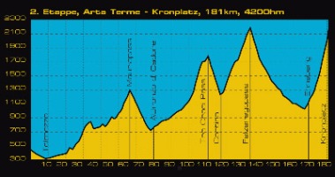 Leider war es mit meiner Schaltung nicht kompatibel, so dass ich die 2. Etappe mit nur 2 zur Verfügung stehenden Gängen bewältigte. Die zweite Etappe startete schon um 7h in der Früh. Schließlich standen 181km und 4200Hm auf dem Programm. Letztendlich waren es tatsächlich 4600Hm. Also fast ein Ötztaler Radmarathon als Einzeletappe. Puuuh, das war heftig. Was beim Ötztaler das Timmelsjoch ist, war hier der Kronplatz. Und der Planet brannte um die 40°. Eigentlich wollte ich aus dieser Etappe aussteigen, da das Schaltwerk mir auf die Nerven ging. Ich kam in keinen Tritt rein, da die Gänge nur so hin und her sprangen. Immer wieder habe ich durchgetreten. Zeter und Mordio habe ich geflucht.