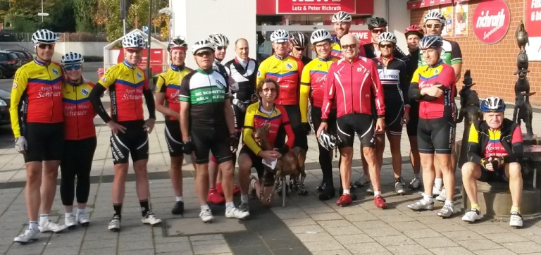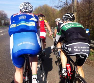 Fast der gesamte Vorstand der Schmitter stand parat der Sonne entgegen zu radeln... 14 weitere Mitstreiter/innen waren zugegen. Bis Frauwüllesheim war man bedingt durch Rückenwind mehr als zügig unterwegs, hier meinte Achim mal ne Pause einlegen zu müssen und die Anderen sonnten sich ein wenig. Ab hier übernahmen unsere Profis die Führungsarbeit. Trotz aufkommenden Gegen-/Seitenwind wurde ein kontinuierliches Tempo angeschlagen und eine zweite Reihe wurde auf Kante auch mal eröffnet. Wie immer kleiner Zwischensprint bei Wissersheim, um in geselliger Runde diese sonnige Runde ausklingen zu lassen...