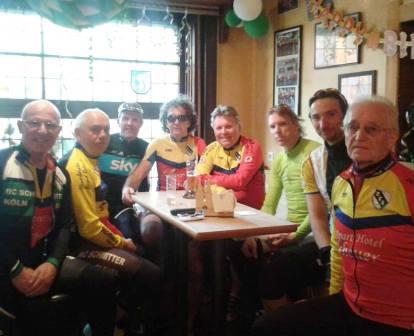 14.00 Uhr standen fast 20 parat um bis Stockheim gemeinsam zu radeln, hier wollten die Hälfte noch über Leversbach der Rest über Embken... hinter Dorr traf man auf ne ViererGruppe die sich schon um 10.00 aufgemacht hatten mal was länger zu fahren. Rene, Otto, Bernd R. und Hubert wurden in die Truppe integriert und bis Knapsack mitgenommen... Berrenrath stieß man noch auf Guggi, Hans und Martin. So konnte der Geselligkeit bei Gerti mit allen Mann/Frau (Inge war frisch aus Malle dabei) in Angriff genommen werden... PS: einer mußte es ja widder übertreiben 190 auf der Uhr...