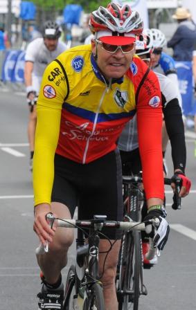 am Start tippt mich 5min vorher der UCI Kommissär auf die Schulter "Wo ist ihr roter Helm?" Ich: "Roter Helm, mmh wozu roter Helm?" "Also eigentlich müßte ich sie jetzt Disqualifizieren, laut UCI Regeln fahren sie in ihrer Klasse mit einem roten Helm" Super, toll, jetzt fahre ich ja schon ein paar Jahre bei den Paras, aber davon noch nie was gehört bzw. mich einer darauf angesprochen...
