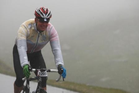 Unten angekommen geht es nahtlos zu der Krönung des Tages. Die ‚lustigen‘ 28 Kilometer mit 1.870 Höhenmetern hoch zum Timmelsjoch auf 2.509 Meter ü.n.Null. Noch einigermaßen angenehme Temperaturen in St. Leonhard sanken diese ständig und mündeten in Regen, der uns ab Schönau bis ins Ziel begleiten sollte. An den letzten Labestationen wurde die Langsamkeit neu entdeckt. Entspannt und ohne Hektik wurde den Mägen nochmals etwas zugeführt, wovon man hoffte, dass es auch dort bleibt und entsprechend verwertet wird. Je höher es geht, je heftiger wird der Regen, je mehr sinkt die Temperatur und je geringer wird die Sicht. Die letzten Kehren vor dem berühmten ‚So-gut-wie geschafft-Tunnel‘, sind mit bunten Trikots geschmückt. Im Tunnel hallen Flüche und glückselige Jauchzer von den Wänden.