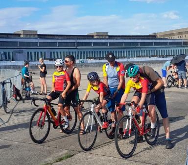 Morgens früh um sieben dreißig wecken, reichhaltiges Frühstück , Rennradklamotten gepackt und schon ging es gen Tempelhof mitten durch Berlin durch. Bei der Ankunft war es schon ganz schön warm und es sollte noch besser kommen, beim Aufstellen und einrichten unseres Platzes wurde uns mitgeteilt das kein Zelt und ähnliches erlaubt ist, klar ist es am Tempelhof windig aber bei angesagten 32c und kein Schatten, Halleluja.... also alles so gestellt das die Autos einigermaßen je nach Sonnenwinkel Schatten spenden konnten...
